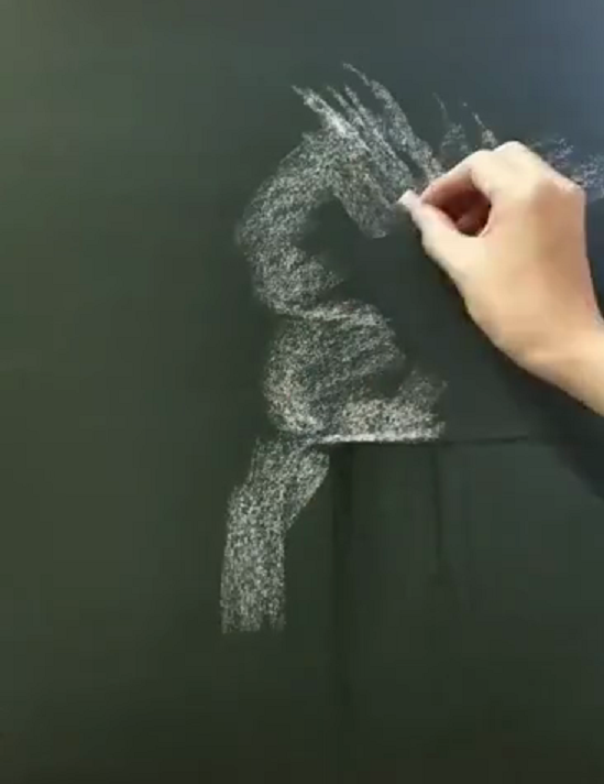 画画是现在很多人都在做的事情,当然要是想要画好也是非常不容易的,今天来看一个美术生用粉笔作画的过程,大家看图中的画面就是在刚开始的时候,可以看到黑板上有了一些痕迹,不过看不清楚是什么,很多网友看到之后都说这是什么怪样子。