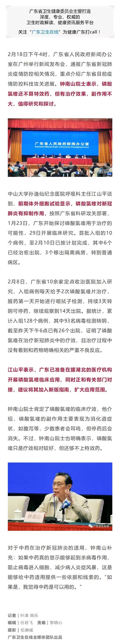 磷酸氯喹证实有效!广东已拟在援湖北医疗机构中临床应用