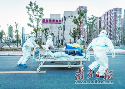 支援湖北荆州的广东医疗队医护人员在紧急转运一名重症病人。