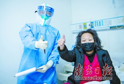 广东医疗队医护人员与患者竖起大拇指,互相加油打气。