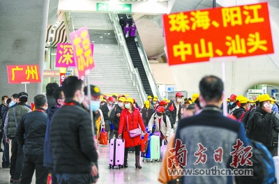 2月18日晚10时,经过6个小时的行驶,从云南昆明开出的广东首趟返岗专列抵达广州南站。