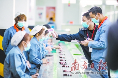 格兰仕车间里,工作人员对生产线的员工进行体温检测。