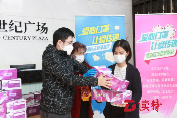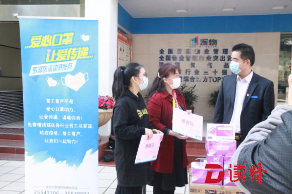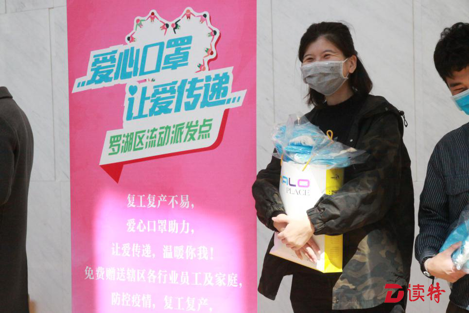 2月21日,罗湖区民政局、区慈善会启动“爱心口罩 让爱传递”罗湖区流动爱心口罩免费派发活动,为辖区22家复工的企业员工及其家人派发1万多只口罩,为罗湖区保安服务公司工作人员发放1万只口罩,为罗湖区80家物业公司工作人员派发累计5万只口罩。