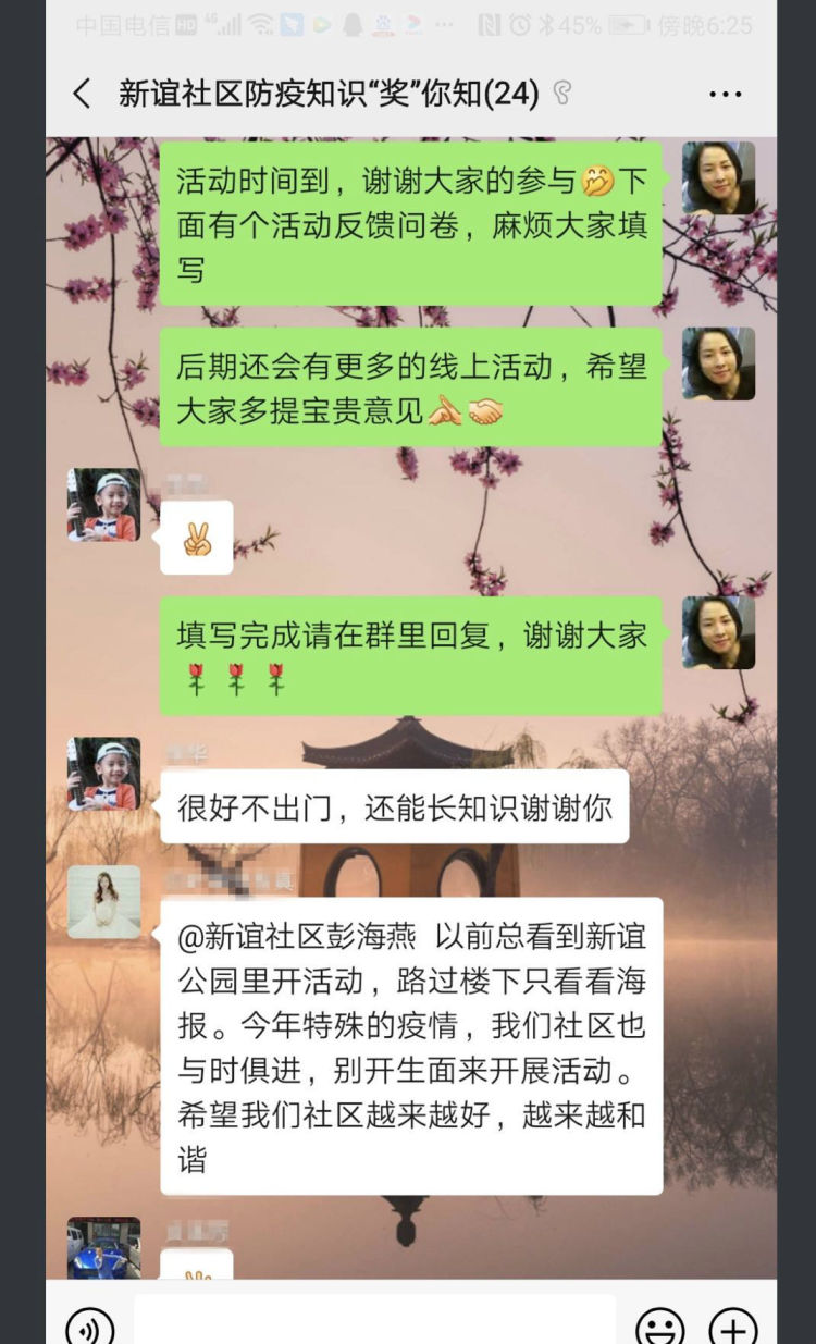 从招募、组建防疫知识“奖”你知的活动微信群,用了不到两个小时的时间,大家都宅在家中,对于活动期待已久,共有22位社区居民参与此次线上活动。工作人员精心准备了相关“新型冠状病毒预防知识”的题目和部分党建的小知识,参与者只需要答对3道题,就可以过关领奖品。大家精神抖擞,拼的不仅是知识储备还有网速,一个小时的时间,群里跳跃了511条互动信息,最终18位居民顺利完成任务,新谊社区提供的奖品口罩,为居民带来阵阵暖意。