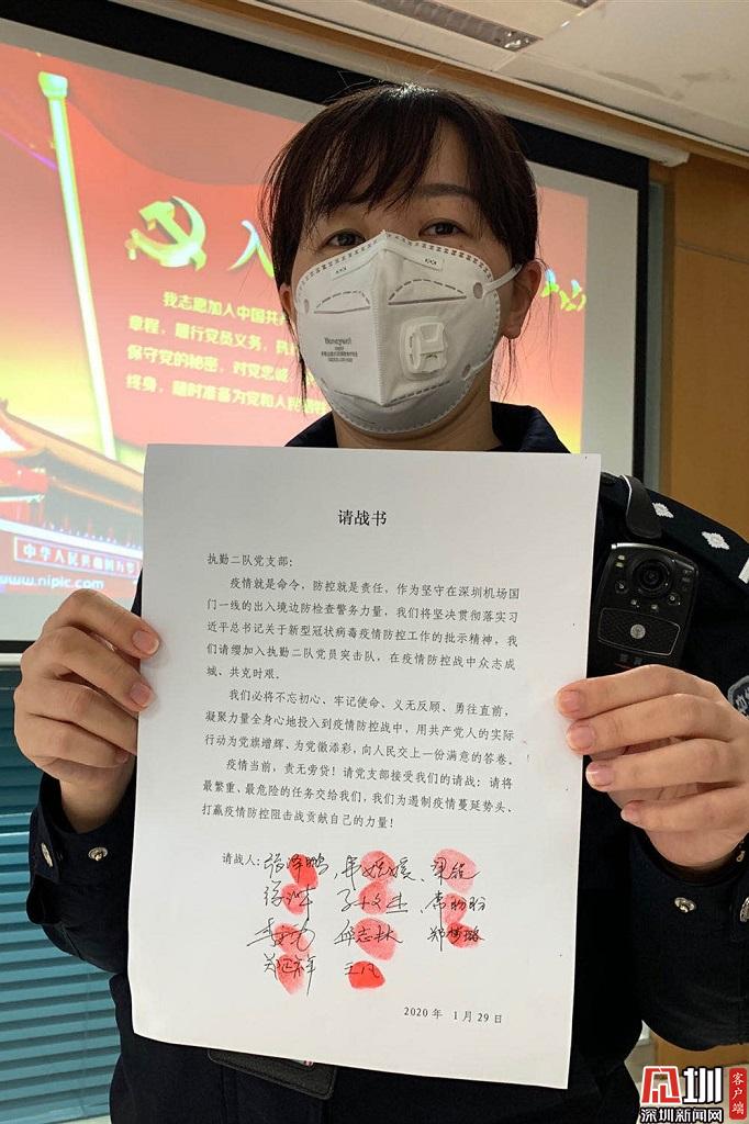 张莹莹,皇岗边检站执勤十六队民警。面对党支部发出的成立防控防疫突击队的号召,“作为一名女警,我请愿冲在一线、守在一线,不怕困难,不惧危险……”她在“请战书”中这样写道。她与队里的女民警一起,作为国门一线执勤的巾帼力量,投身到抗击疫情的第一线。