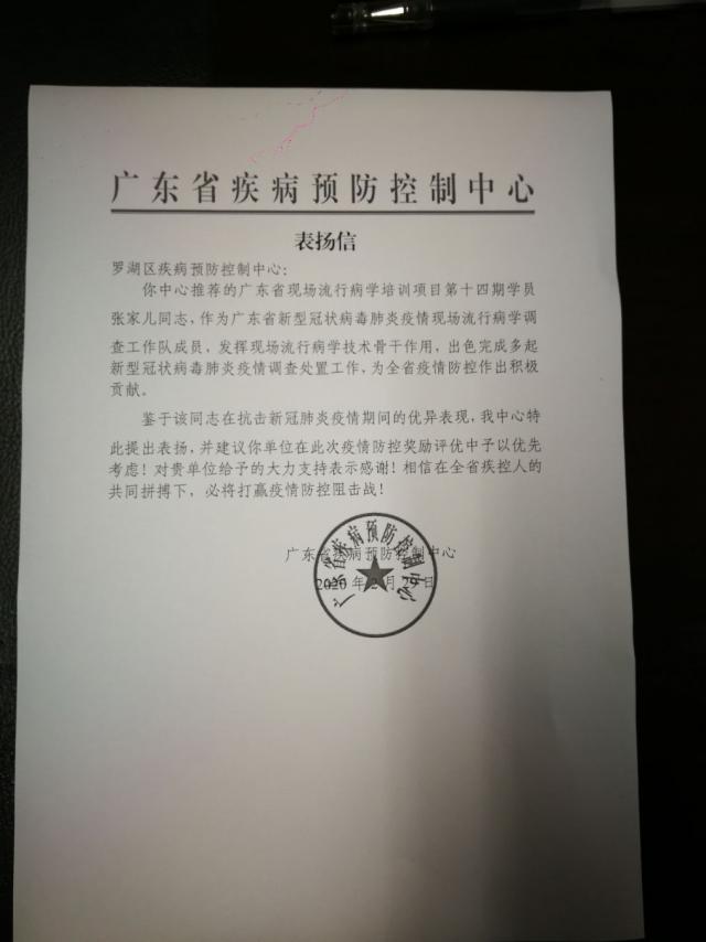 近日,罗湖区疾病预防控制中心收到一封来自广东省疾病预防控制中心的表扬信,对广东省现场流行病学第十四期培训项目的学员张家儿提出特别表扬,表扬其在"新冠肺炎"疫情防控中工作的出色表现。