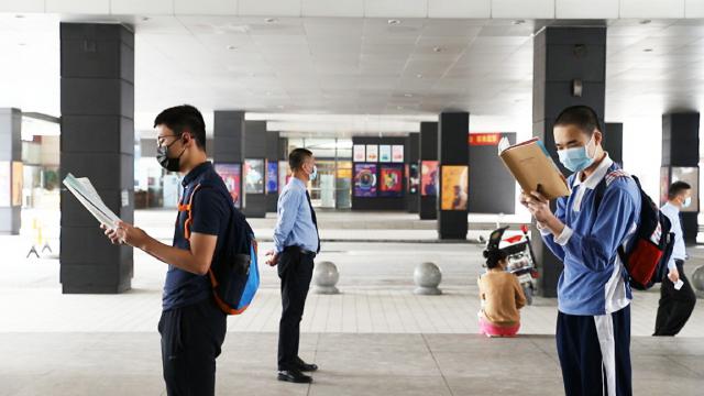 深圳图书馆迎来恢复开放的第一个周末。上午 9 时,不少读者就在深圳图书馆一楼北门口外等候,排队时自觉隔开了 1.5 米。深圳图书馆开放时间为周二至周日的 10 时至 16 时,开放区域为主馆舍一至三楼图书、报刊借阅区。目前深圳图书馆采取实名预约制,在馆读者人数不超过 300 人,人数达到上限后实行"出一进一"动态管理。