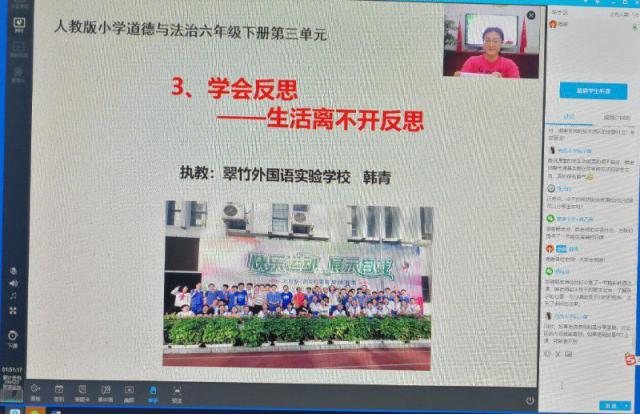 近日,翠竹外国语实验学校承办了市小学道德与法治学科第三次线上教研活动,市兼职教研员、罗湖区学科名师韩青老师执教了腾讯课堂网络直播课《学会反思——生活离不开反思》,深圳市全体小学道德与法治教师共 2000 余人齐聚一堂,观摩了这节精彩的直播课。