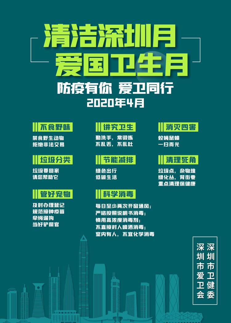 防疫有我,爱卫同行。今年4月是深圳市第33个“清洁深圳月”,也是全国第32个“爱国卫生月”。今年是特殊的一年,经历新冠疫情,市民对卫生和环境更为关注,对参与清洁卫生的意愿也更高,所以,为积极响应全国爱卫会倡导的“爱国卫生月”活动,推进新一轮的环境卫生清洁行动,今年“清洁深圳月”的主题为“全民参与清洁卫生,共建共享健康家园”。