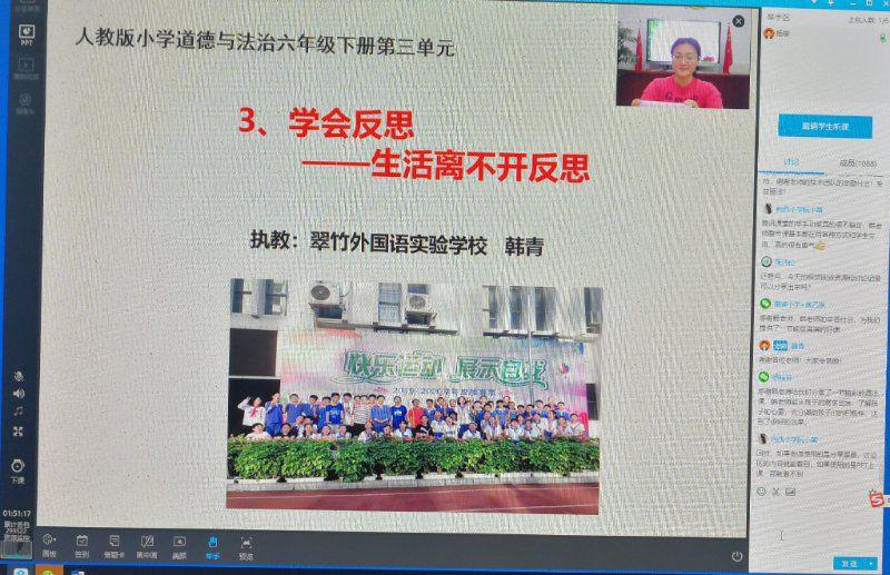 近日,翠竹外国语实验学校承办了市小学道德与法治学科第三次线上教研活动,市兼职教研员、罗湖区学科名师韩青老师执教了腾讯课堂网络直播课《学会反思——生活离不开反思》,深圳市全体小学道德与法治教师共2000余人齐聚一堂,观摩了这节精彩的直播课。