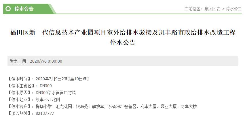 2020年7月9日23时至10日6时,福田区凯丰路西北侧将停水,受影响的有福田区汇龙花园、银海苑等小区。