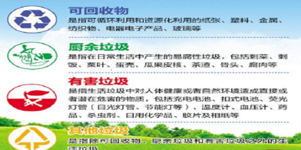 可回收垃圾:包括废纸、塑料、玻璃、金属和布料五大类。厨余垃圾:剩菜剩饭、骨头、菜根菜叶、果皮等食品类废物。