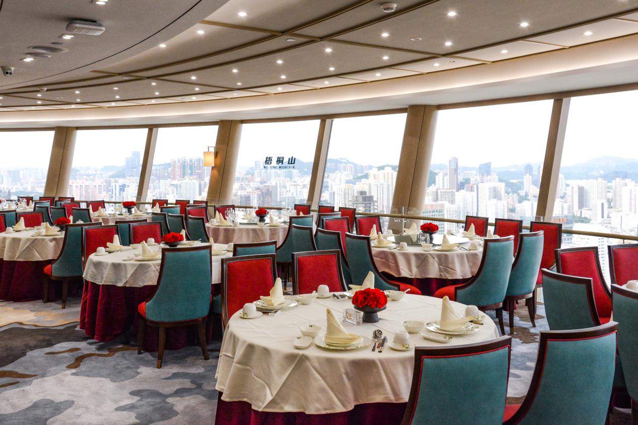 宾客置身旋转餐厅,与香港隔海相望,深圳河、深圳湾、梧桐山、地王大厦、平安国际金融大厦等深圳美景尽收眼底,旋转餐厅每小时转一圈,使宾客在享受美食的同时还能360°俯瞰深圳的繁华,感受大都市的青春与活力。