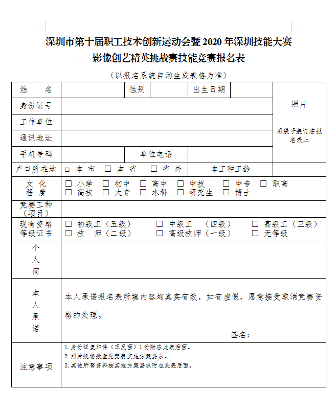 深圳市第十届职工技术创新运动会暨2020年深圳技能大赛——影像创艺精英挑战赛技能竞赛报名表