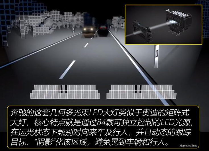 奔驰的这套几何多光束LED大灯有点像是奥迪的矩阵式大灯了,奔驰玩起灯来也是很优秀的,几何光束大灯核心特点就是通过内部的84颗可独立控制的LED光源,行车远光灯会甄别对向驶来的车辆或者行人,并且动态的跟随目标,之后阴影话该区域,避免晃到车辆和行人。