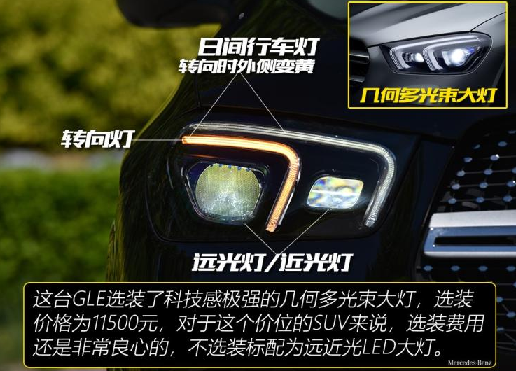 2020款奔驰GLE的大灯非常的深邃且犀利了,还可以选择几何多光束大灯,科技感和照明效果非常强,