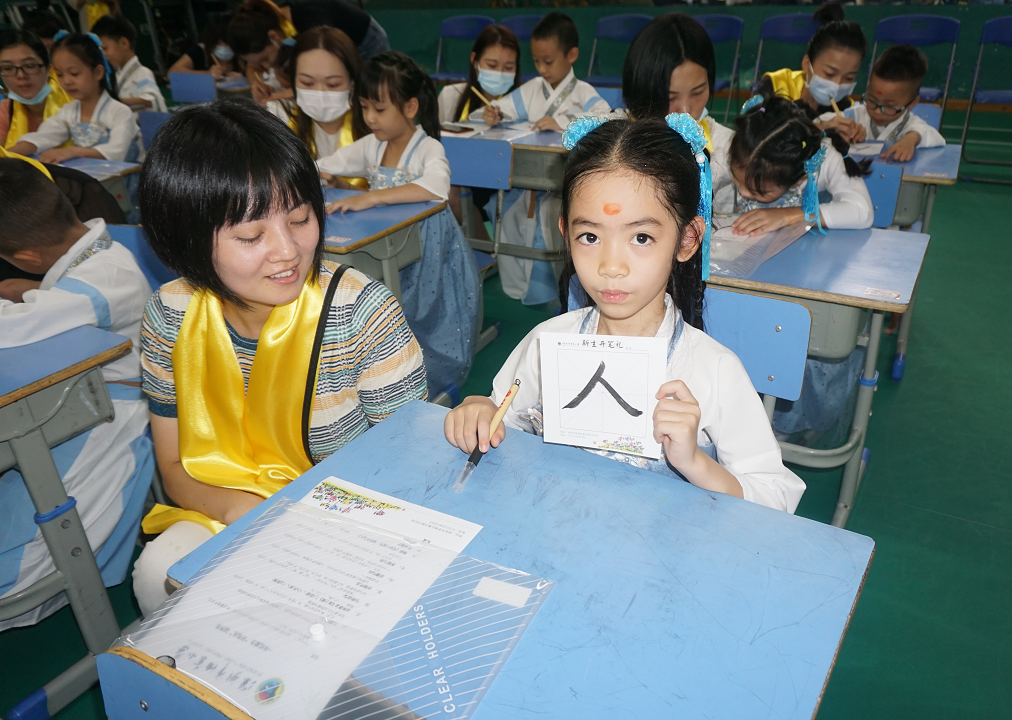 朱砂启智是开笔礼的重要一环,前来观礼的各位领导、老师为孩子们亲点朱砂痣。“痣”通“智”,寓意开启学童智慧,从此耳聪目明、健康成长。“人生聪明识字始。”在启蒙描红环节,怡景小学校长苏涛首先为大家阐释“人”字一撇一捺的智慧,然后请家长帮助学生在纸上描出“人”字。