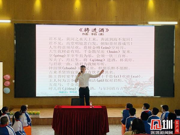 为进一步弘扬中华优秀传统文化,近日,深圳市锦田小学特邀青年文化学者、深圳市百姓学习之星、深圳市公益阅读推广人、深圳市首届家园文化文学会会长晋玉东为广大师生开展了一场别开生面的“中国古典诗词朗诵艺术鉴赏——兼谈如何朗诵好一首诗”公益文化讲座。罗湖区锦田小学德弘校区副校长刘向阳、罗湖区锦田小学德弘校区主任张俊晖、罗湖区未来学校主任谢淑红、德弘二年级家委代表以及语文科组老师,一同参加。活动由班主任梁文雅和学生刘沛东、张家琪共同主持,近200名学生参加了讲座活动。整场讲座师生热情高涨,主讲嘉宾深入浅出、娓娓道来,参与学生思维活跃、表现积极,带动校园形成了学习诗词文化的良好氛围。