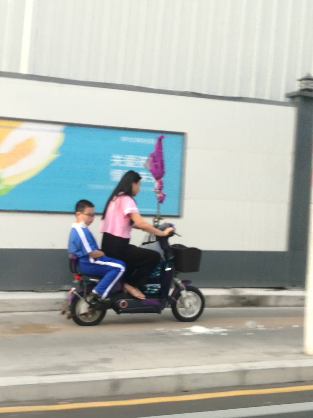 这辆电动车载着一大一小,两个人都没有戴头盔。