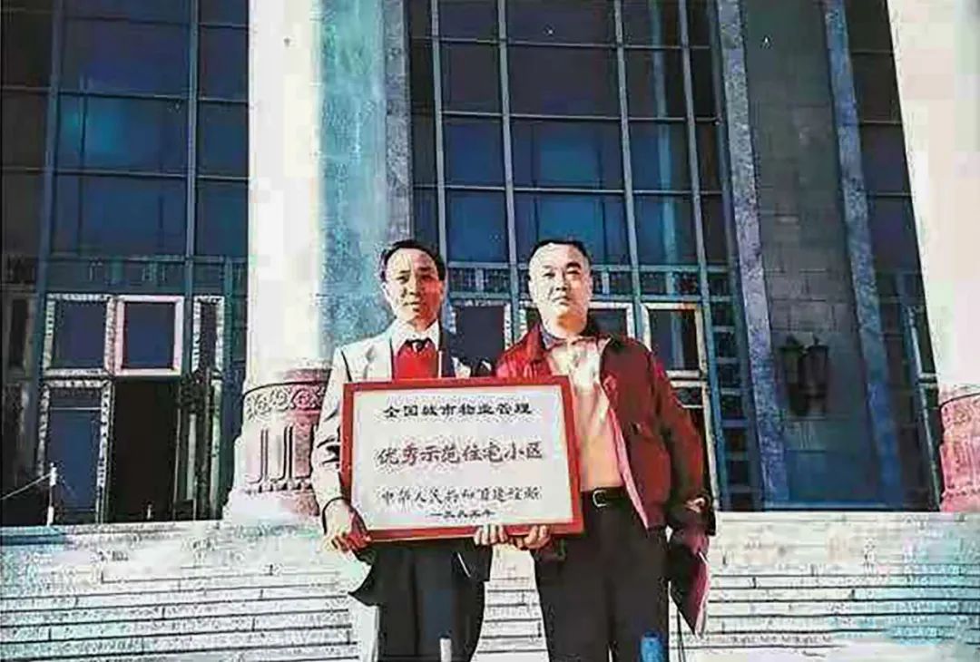1995年,时任物业公司总经理陈之平和时任天景花园管理处主任李有才在北京人民大会堂领取天景花园被评为全国“优秀示范住宅小区”奖牌后合影留念。