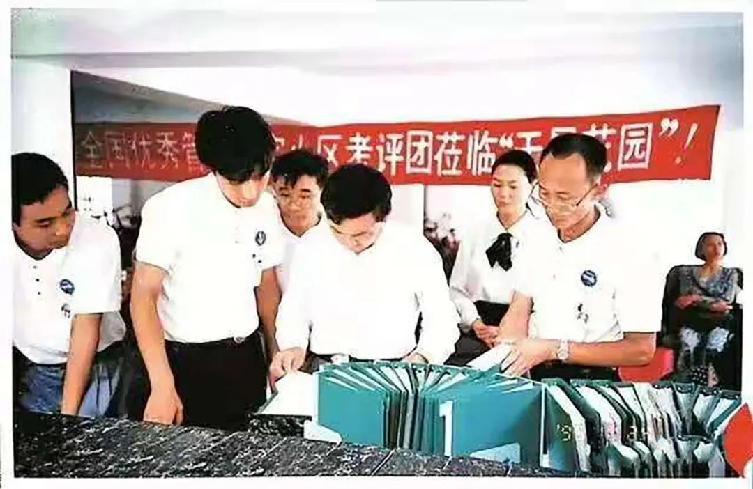1995年,全国“优秀示范住宅小区”评审团对天景花园小区物业管理工作考评现场。