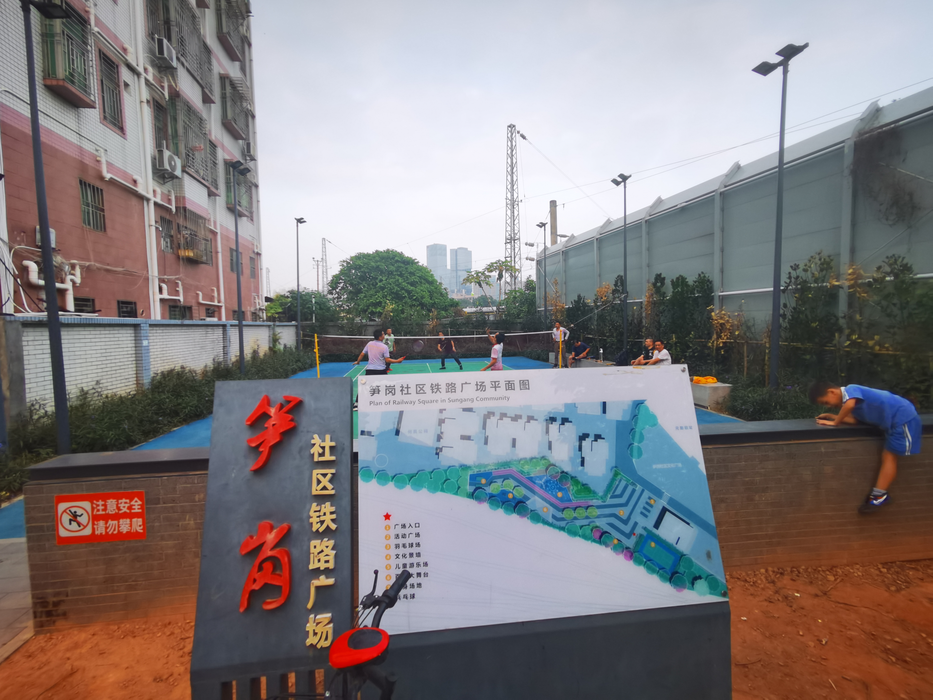 2018年8月,罗湖区启动全区首批12个城中村综合治理,笋岗社区是其中之一。结合综合治理契机,笋岗社区铁路广场有了绿植、橡胶跑道、无人值守感应电箱。为防止火车经过带来噪声污染,有关部门在广场靠铁路一侧安装了高5米、长450米的隔音墙,此外还配备了路灯和LED大屏幕,以前一到晚上黑乎乎的场景再也不见了。