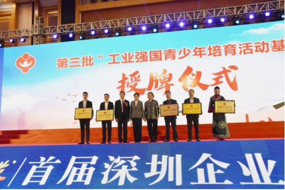 张帼英、市关工委常务副主任钟志坚为有关企业授予“工业强国青少年培育活动基地”牌匾