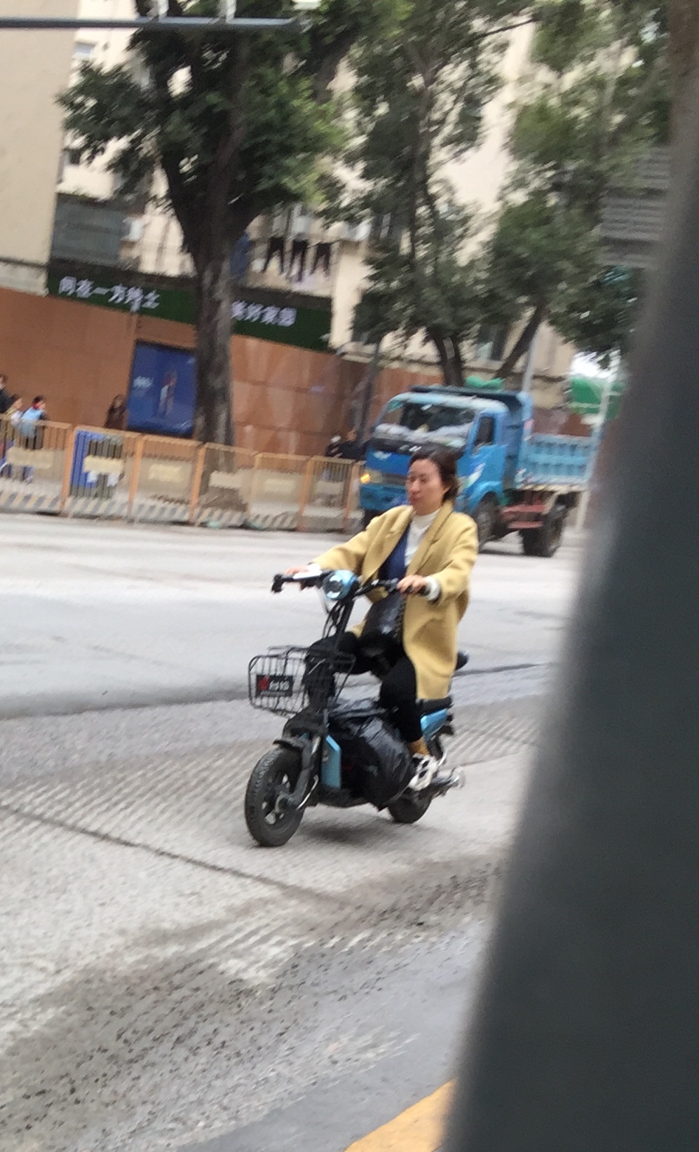 骑电单车的市民不戴头盔,在机动车道上骑行。