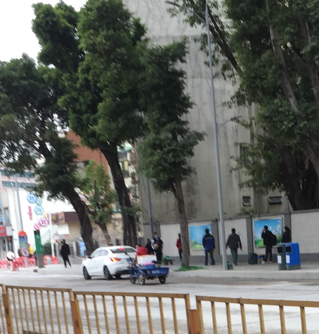 骑电动三轮车的市民不戴头盔,在机动车道上骑行。