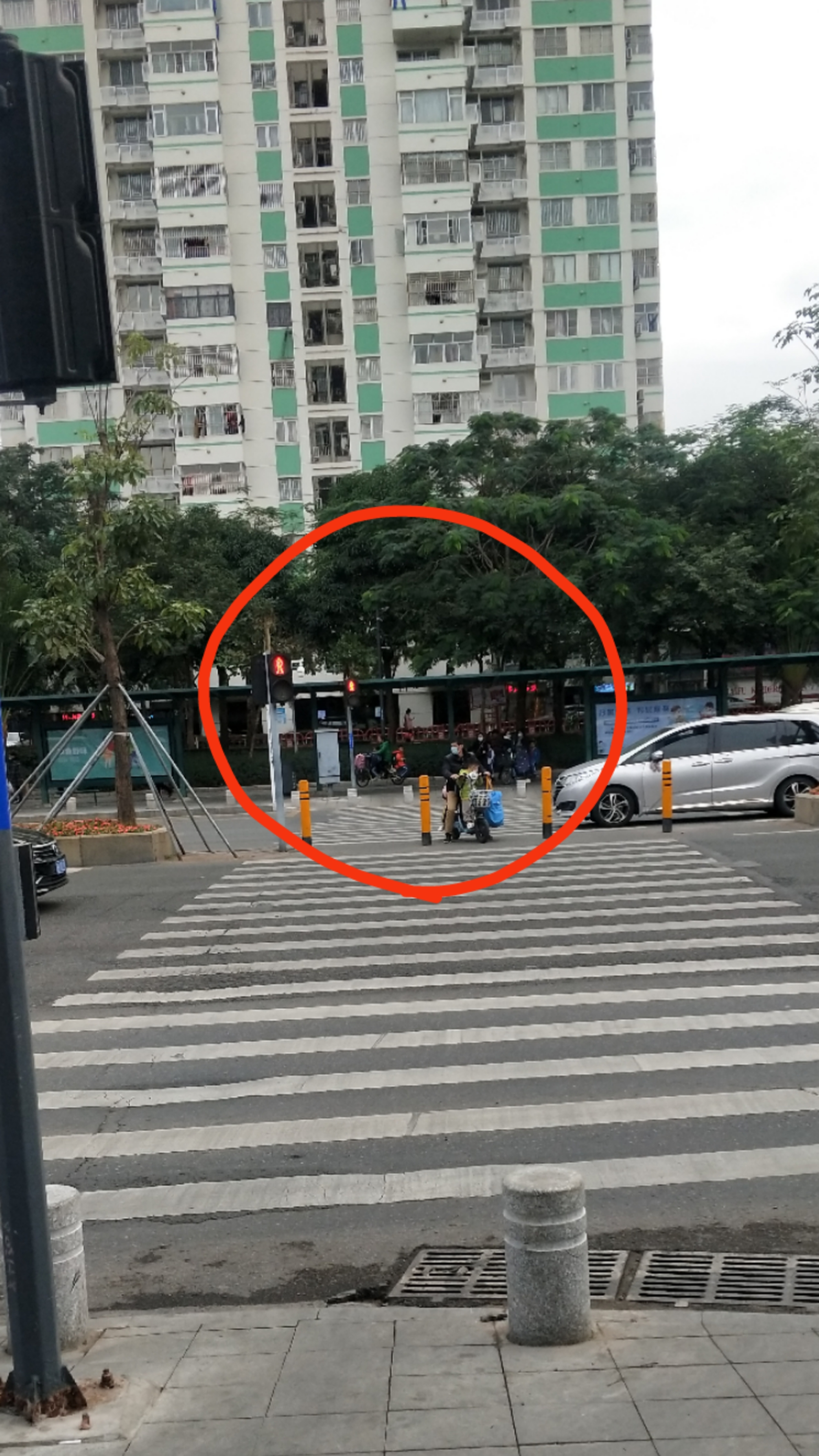 骑电动车不带头盔,还不遵守交通规则,红灯还在横穿马路。