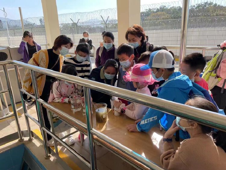 随后,小学生们排着整齐的队伍去参观净化厂的相关设备,由水厂工作人员和老师共同带队,在出水口处进行参观。工作人员准备了三杯不同水质的样本,现场讲解污水在处理前后以及不同阶段的外观特征,小朋友们认真听并仔细观察采样,受益匪浅。