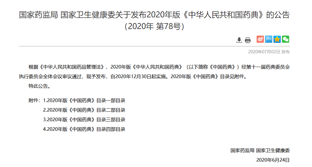 国家药品监督管理局、国家卫生健康委,正式颁布 新版《中华人民共和国药典》,于 2020年12月30日起正式实施。