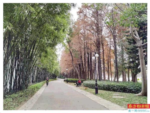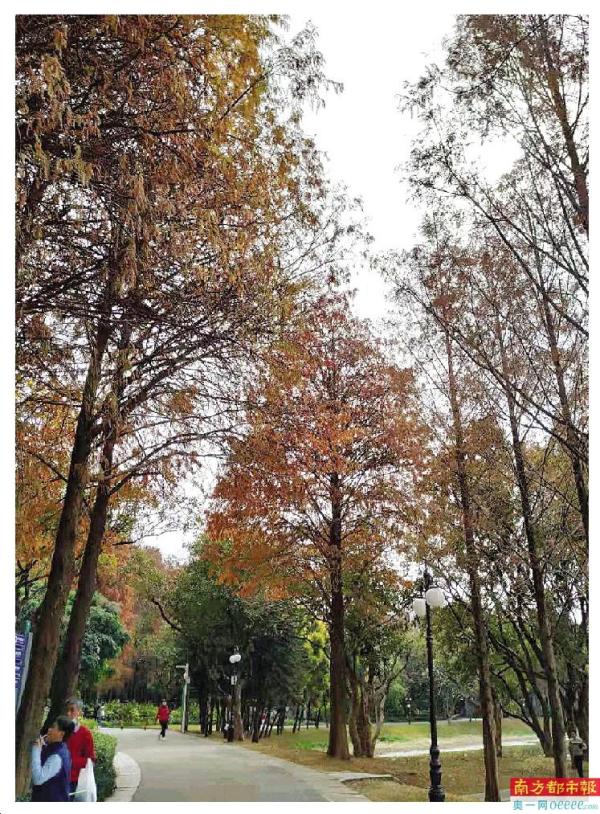 走在洪湖公园南区行道间,一大片或红或黄的落羽杉在绿色林间探出头,一层又一层,随手一拍,便是风景。置身林间,看孩子抓着风筝嬉闹奔跑,坐着轮椅的老者面对家人的镜头微笑,运动爱好者不急不慢地跑步,感觉仿佛闯入了彩色童话世界。