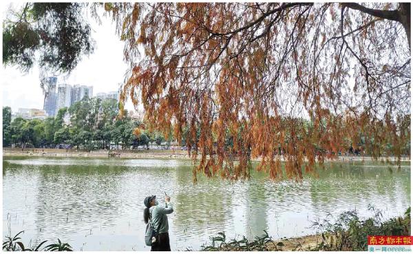如果走累了,在路边的凳子坐下,抬头便能看到枝头上随风摇曳的树叶儿,在阳光下闪着点点金光,低头见针状红叶铺满一地,雪花般挂在绿色灌木丛上,透着一股万物生长的蓬勃活力。此时,若将镜头移向湖面,还能惊喜发现,远处醒目的地王大厦和京基100,在垂向湖边的“火红羽毛”衬托下,平添了几分诗意。