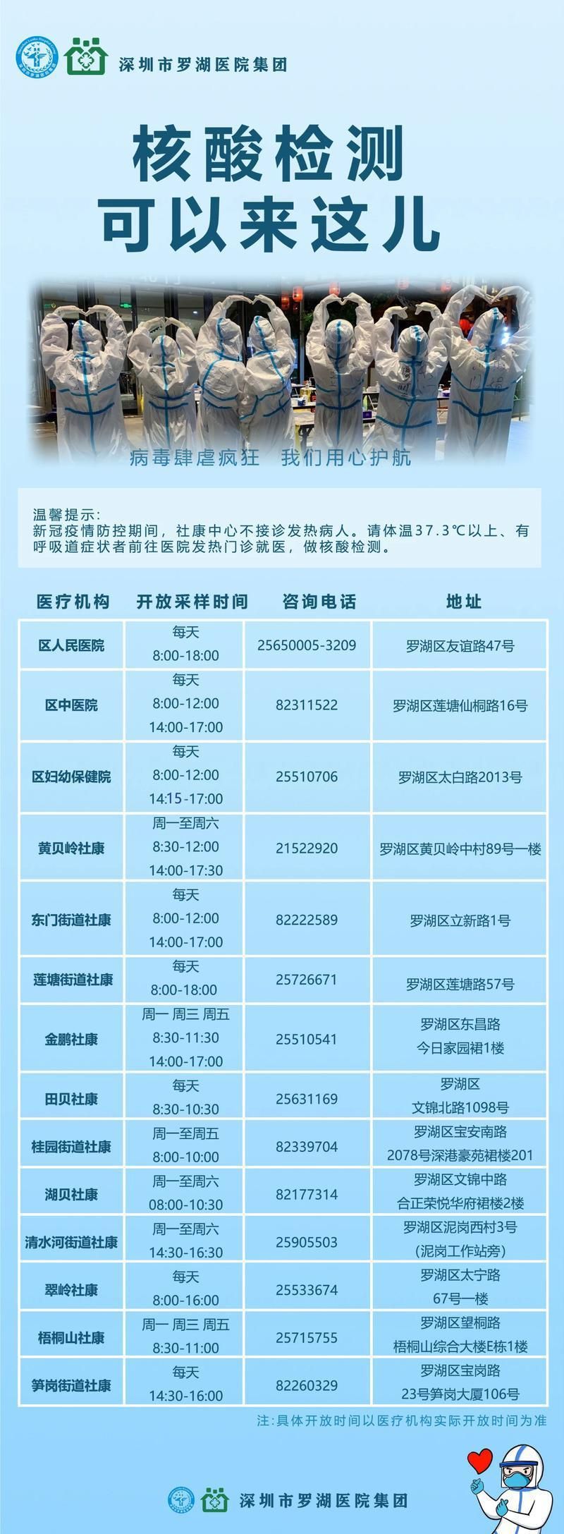 目前,罗湖医院集团开放14个核酸检测现场采样点。点击查看大图获取具体地址。