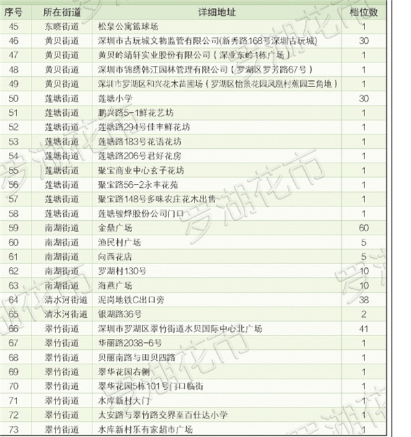 罗湖区共开设近500个花市铺位,遍布全区10个街道,近40个社区。同时,罗湖区还特别制作了花市地图,最大限度的方便市民就近购花。