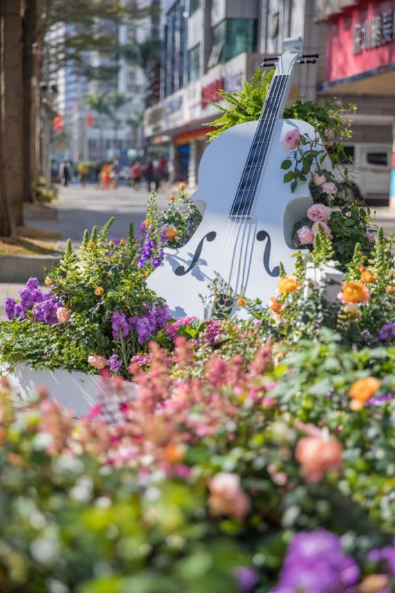 中旅大厦街角,粉紫色的花丛中静静立着白色的大提琴,粉色的月季缠绕其上,音符在花朵枝头跳跃,小蜜蜂在伴奏,蝴蝶也在伴舞,所有最好的时光,最灿烂的风景,都缓缓流淌起来,婉转柔长,扣动心弦。
