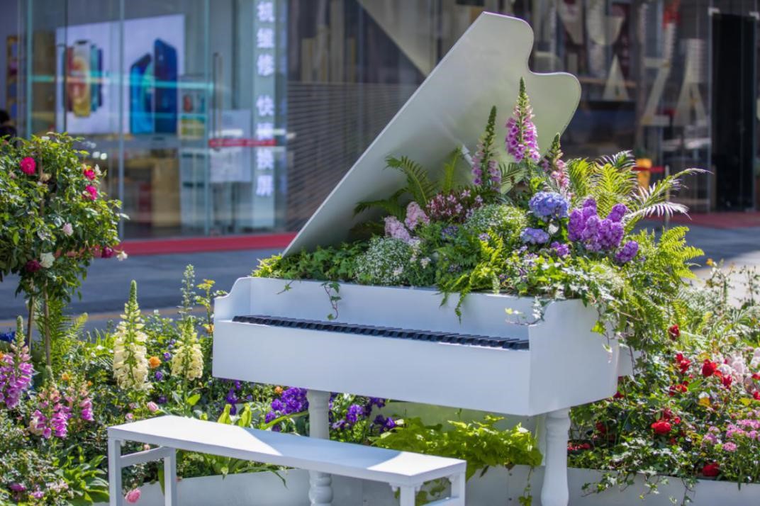 汇金广场旁,优雅的白色钢琴弹奏出花团锦簇的美丽乐章,蜿蜒流畅的花境中行云流水般的音符阐释着浪漫的情怀,似乎伴随着悠扬的旋律,在诉尽无限的爱恋。