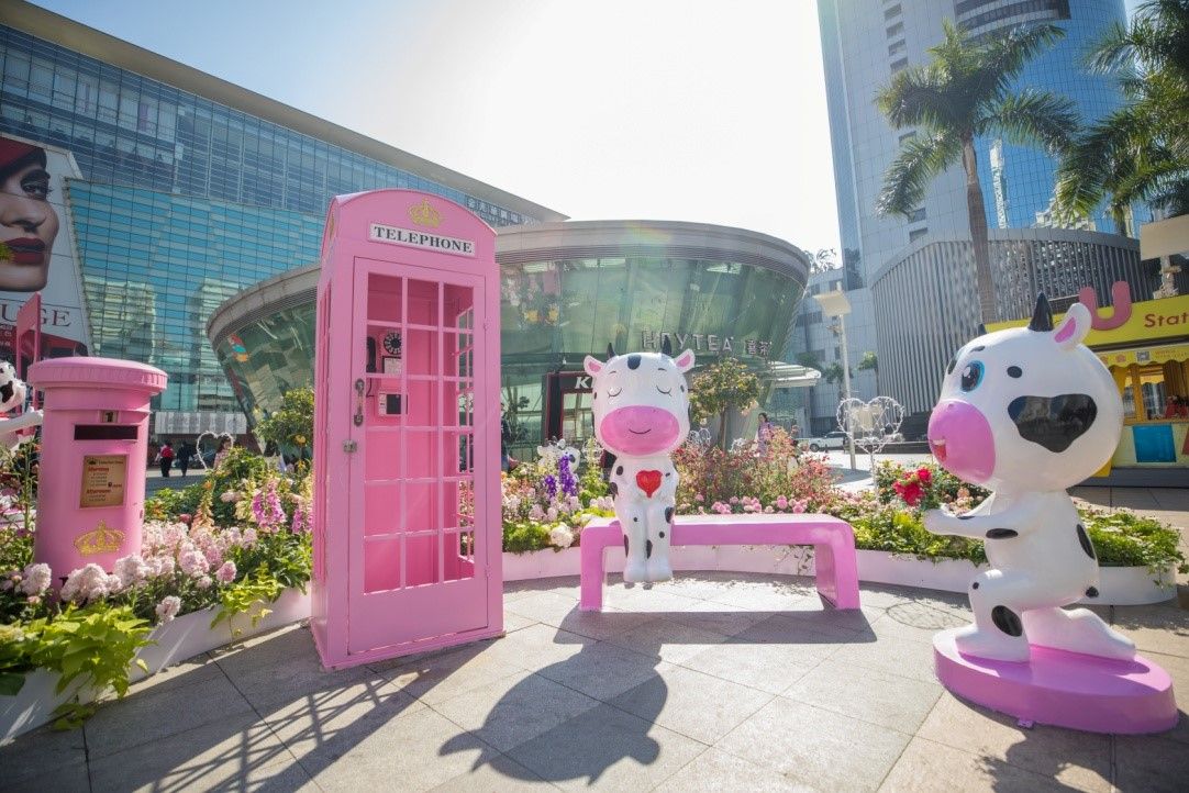 金光华广场设有粉色调的各式摆件: