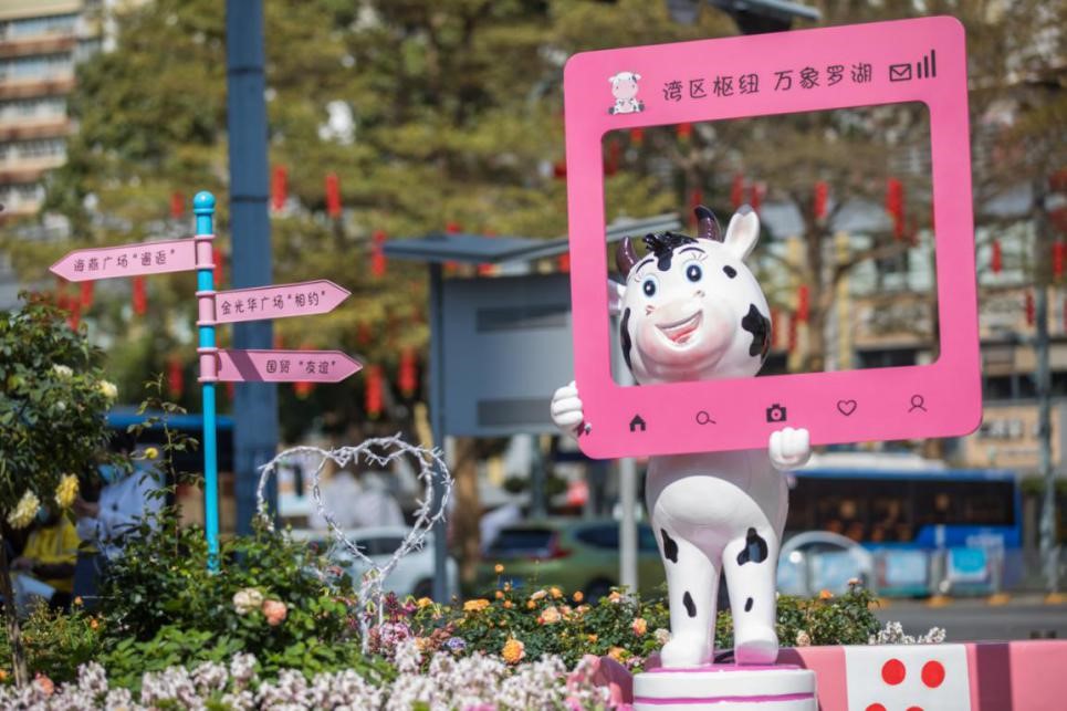 还有一只小牛,举着粉色的打卡框,人民南街头树梢头红灯笼,“湾区枢纽,万象罗湖”的繁华景象净收眼底。