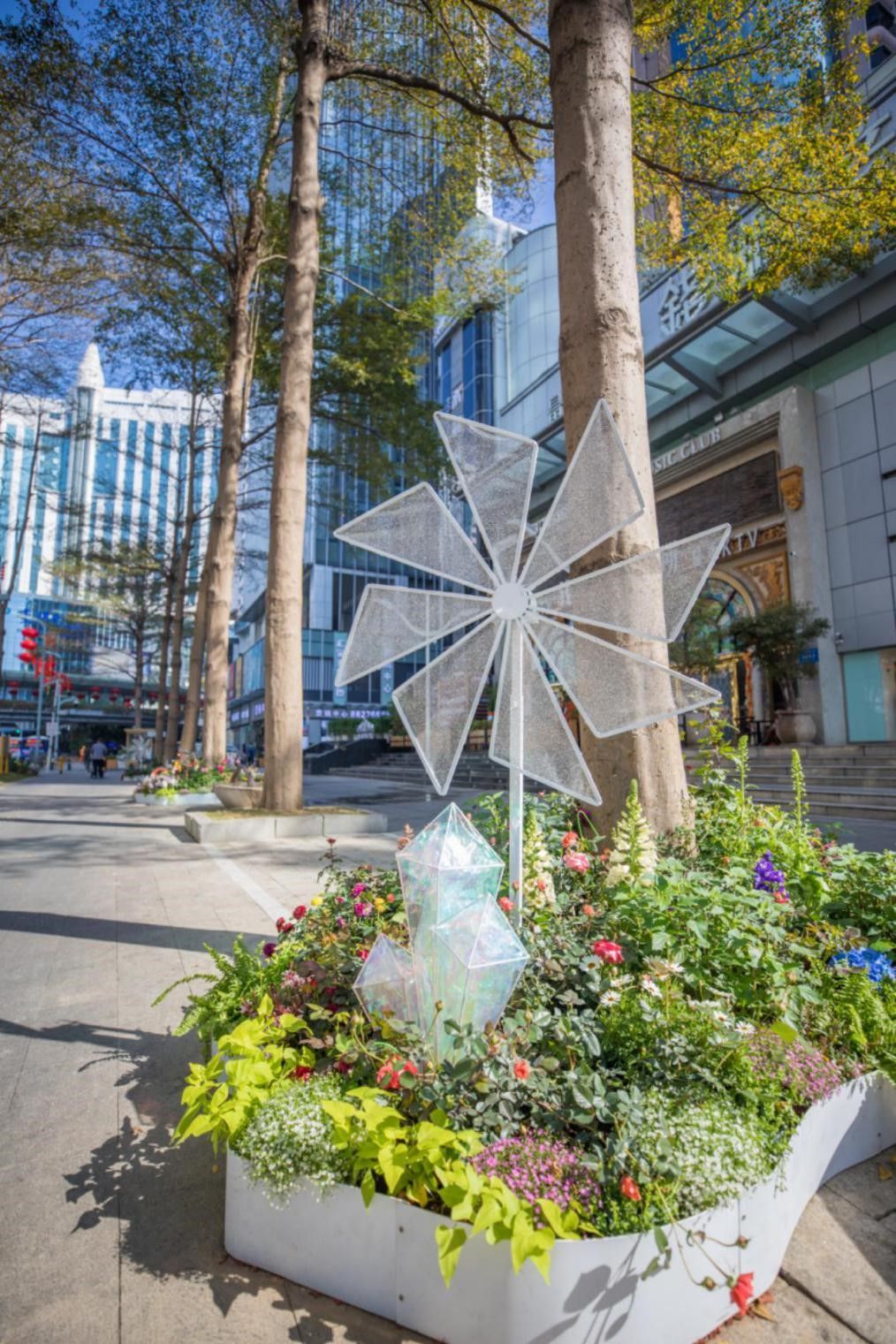 人民南路沿线绿地中各色花卉争奇斗艳,红的像火,粉的像霞,让人目不暇接。一阵风吹过,白色的风车随着风儿旋转,转走烦恼,转来好运,风儿、树儿、花儿、草儿共同奏出一支支美妙的乐曲,谱写出华彩的乐章,让我们踏着音乐的节拍,以愉悦的心情迈入新的一年!