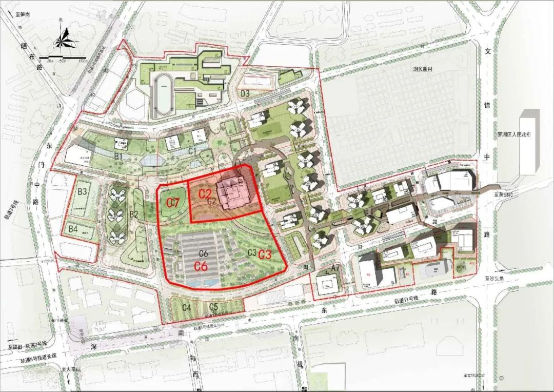 C2地块作为湖贝片区统筹项目中区即核心重点区域,除了考虑自身定位外,还需整体处理与周边C6古村落、C3中央公园及C7文化设施的关系,营造出旧村、公园与文化“三位一体、无界融合”的人文公共绿心,因此整个中央区需要统一在国际竞赛阶段考虑设计。