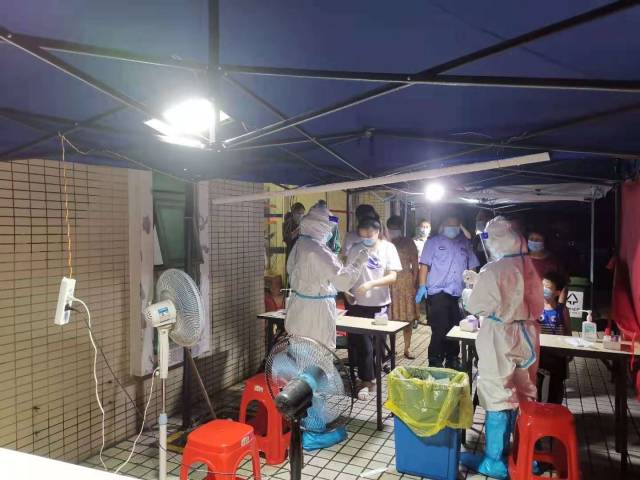 当晚,风雨一阵紧接一阵,在小区门口搭建临时核酸检测点不一会就变成“泽国”。面对突发的天气状况,为加快核酸检测速度,避免居民往返带来的不便,莲塘街道党工委委员、畔山社区第一书记陈文磊紧急召集社区党委及管理处人员召开工作部署会,决定将临时核酸检测点转移至小区内,在目标楼栋前选择符合防疫要求的地方搭帐篷,同时对工作人员进行分工分组明确任务,第一组人员在业主群进行核酸检测预通知,告知群众核酸检测的流程和注意事项及要求;第二组人员进行上门摸排、通知各位业主耐心在家中等候通知再下楼排队登记,避免聚集,确保应检尽检、不漏一人;第三组人员值守采样现场,协助医务人员进行登记信息、维持秩序。