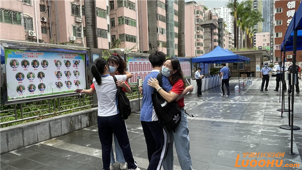 老师在考场入口为考生送上暖心拥抱,希望大家都能超常发挥,考出好成绩。