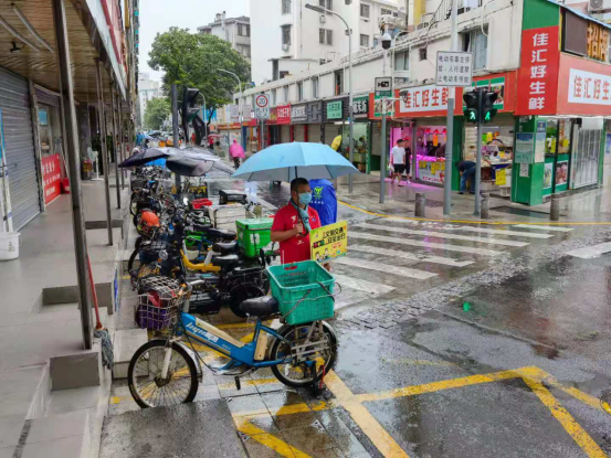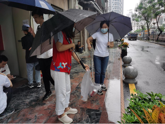 楼道里,社区工作人员和网格员上门入户宣传工作,以发放宣传单的方式对小区居民、商户逐一进行宣传,号召每位居民从我做起,从身边的小事做起,创建健康文明的生活方式。即便遇上台风天气,这群来自桂园街道的工作人员仍然冒雨行动,为文明城市创建忙碌不停。“您好,请将共享单车停放在指定的区域。”在人行道上不时传来劝导提醒,党员志愿者更是主动出力协助。不远处的斑马线上,志愿者撑伞竖牌,提醒市民安全出行。