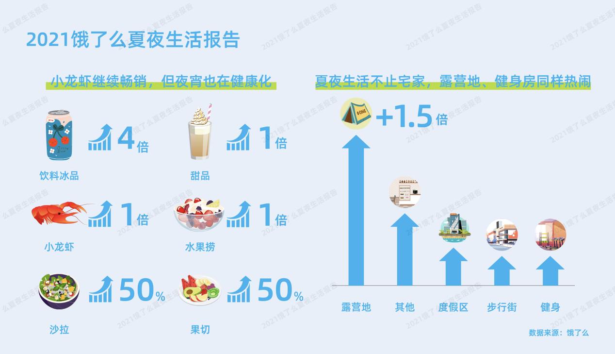 还在讨论“夜宅经济”热?饿了么近日发布的《2021饿了么夏夜生活报告》显示,夜间外卖消费场景正在不断扩大。今年夏天以来,夜间露营地、景区度假酒店、步行街综合体、健身房等多场景下的外卖单量环比增幅均在三成及以上,同比去年涨幅均在一倍及以上。其中,来自房车露营地的夜宵订单量更是环比增长近2倍。