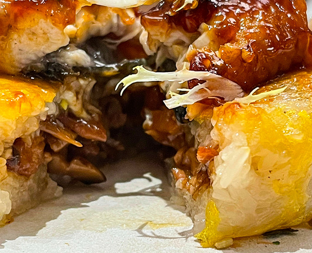 粘稠饱满的大颗粒糯米,包裹着沁出汁水的鸡肉,糯米鸡正中央的肉切成块,满足的咬上包含所有配料的一角,糯米的咸甜、鸡肉的鲜,氤氲迷人,足够回味好久。