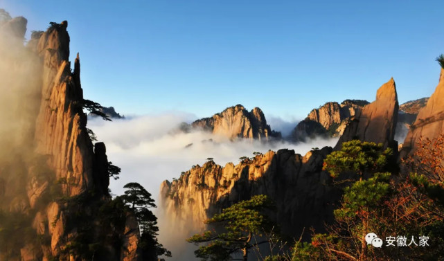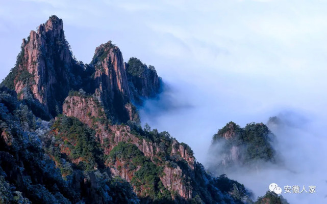 黄山自古云成海。每逢雨后初晴,谷底水汽凝成云雾,弥漫山谷,形成云海。群峰之间,顿时白浪滔滔,浩瀚无涯。峰尖浮海,犹如孤屿,时隐时现,瞬息万变,气象万千。