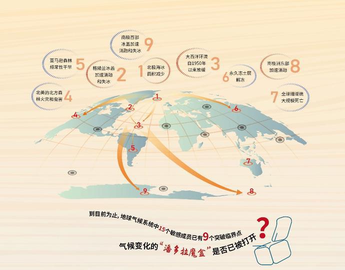 科学家研究认为,地球气候系统中存在着15个“气候敏感成员”,这些成员如同地球的“敏感神经”,它们的变化可能发生在某个区域,影响范围却可能达到1000千米以上,甚至会对半球乃至全球的气候造成影响。现已有9个敏感成员被激活,包括北极海冰面积减少、北美的北方森林火灾和虫害、格陵兰冰盖加速消融和失冰、南极西部冰盖加速消融和失冰等。“敏感神经”被激活将导致气候效应的“正反馈机制”发生作用,同时它们之间又存在关联,一旦被突破还将触发一系列的“级联效应”,推动更多的“敏感成员”越过临界点,加剧全球气候恶化,严重威胁人类生存发展与文明存续。