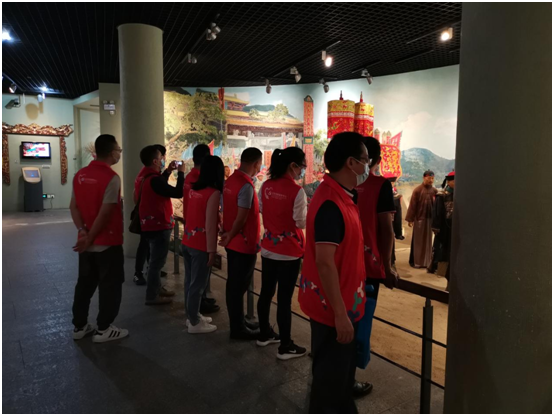 游览中,大家移步到天后庙前“辞沙”祭展览区,大型的祭祀活动、祭拜品牛羊猪去肉留皮,置于海边沙滩。据说明朝的赤湾天后庙是“海上丝绸之路”上的重要一站,郑和下西洋路过零丁洋,就曾在此“辞沙”。大家看到此场景,仿佛身临其境地感受到了当时震撼的活动场面。
